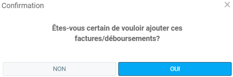 Une fenêtre de confirmation s'affiche avec le message suivant: "Êtes-vous certain de vouloir ajouter ces factures/déboursements?"