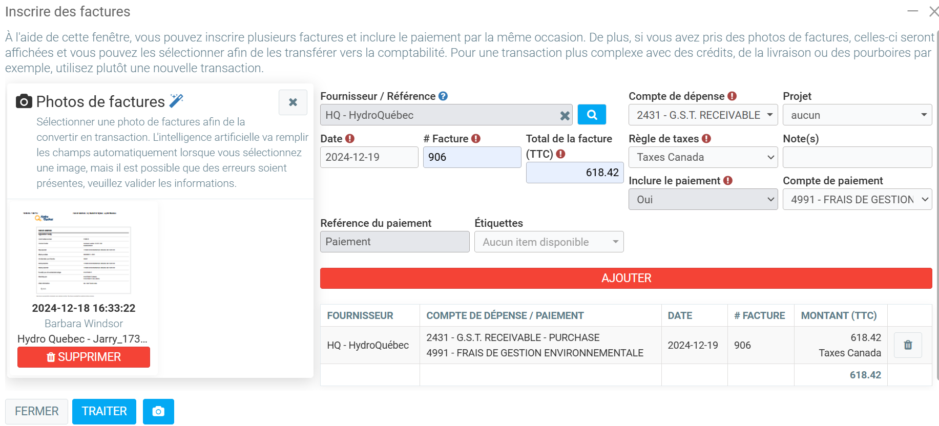 Lorsque vous avez terminé d'entrer les données des photos que vous désirez transférer à la comptabilité, cliquer sur le bouton bleu Traiter au bas de l'écran à gauche.