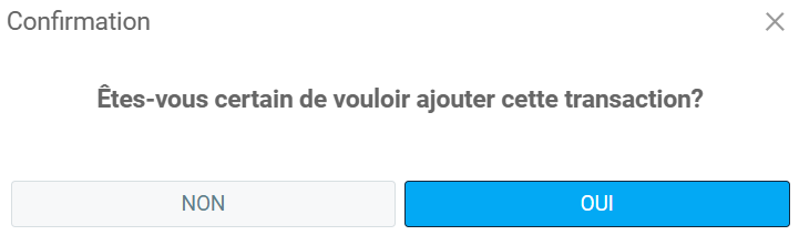 Une fenêtre de confirmation apparaît, avec le message suivant: "Êtes-vous certain de vouloir ajouter cette transaction?". Cliquez sur Oui.