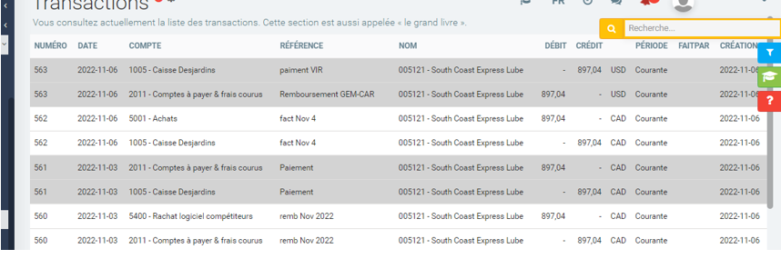 Allez dans le menu “Comptabilité” / “Transactions” pour consulter des transactions