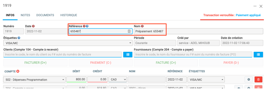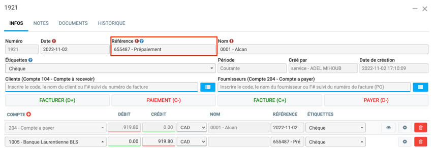 Inscrivez aussi le numéro de la facture dans la référence de paiement et refermez les deux transactions en vous assurant d'enregistrer.