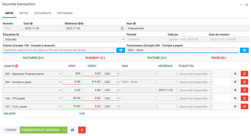 Sur la nouvelle transaction, entrez de nouveau la référence (Date) et le nom (Prépaiement) et cliquez sur le bouton PAYER (D-).
