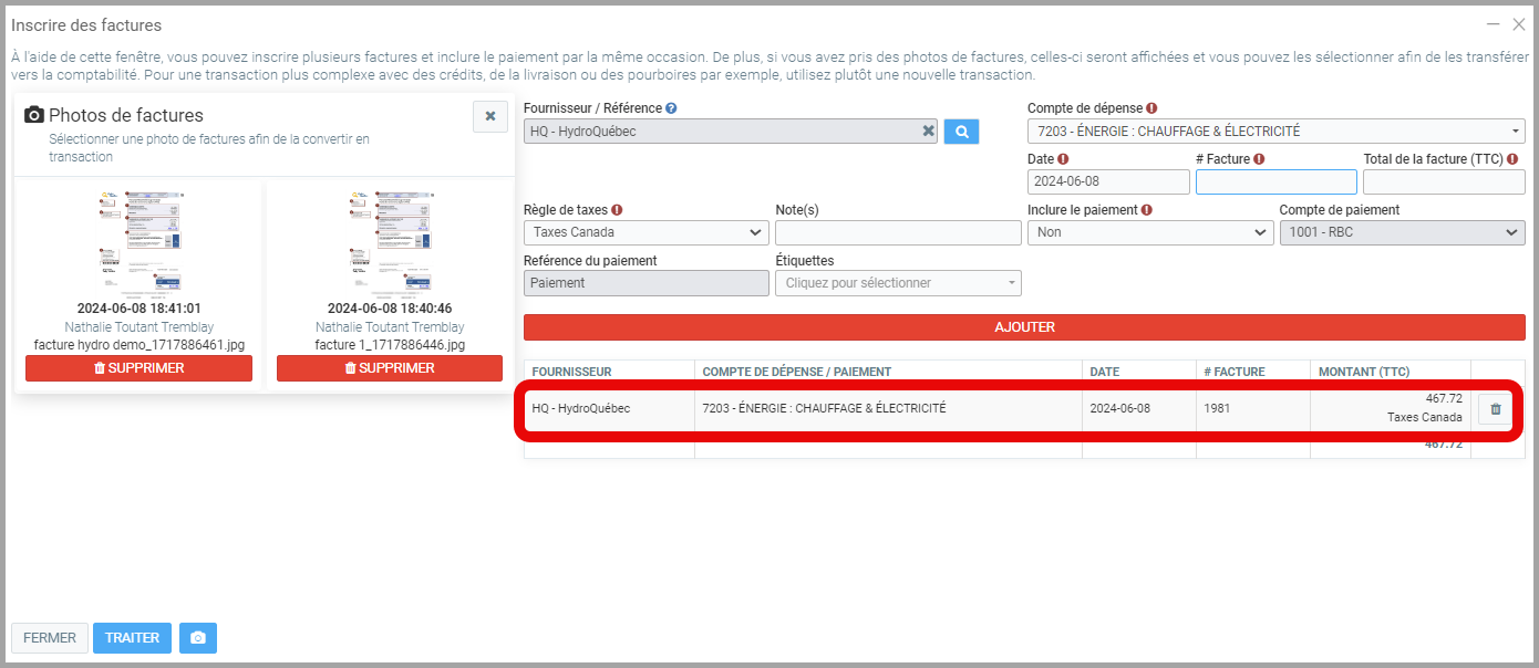 Lorsque vous avez complété la saisie de vos factures, cliquez sur Traiter.