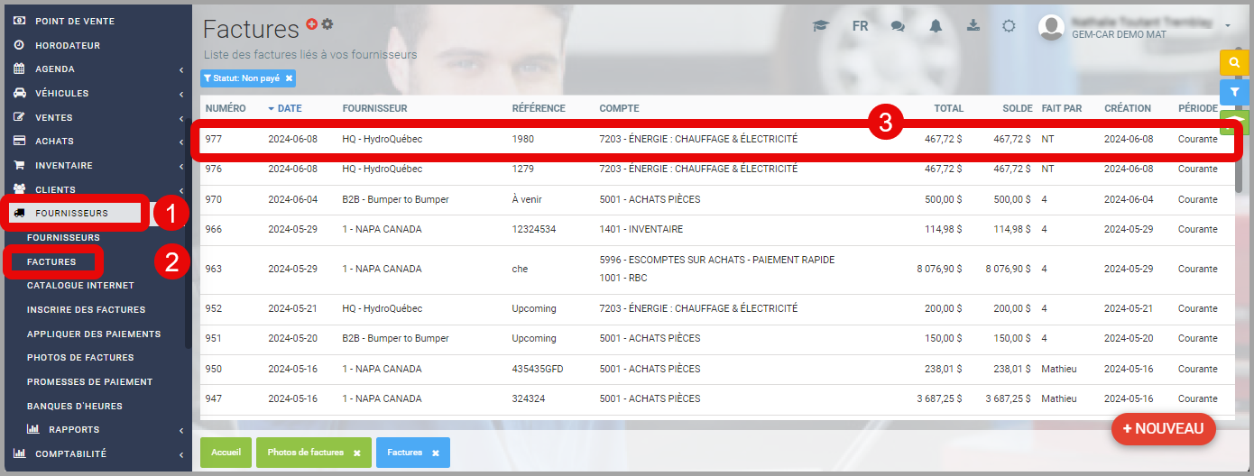 À partir du Menu principal situé à gauche de l'application, cliquez sur Fournisseurs > Factures > +Nouveau.