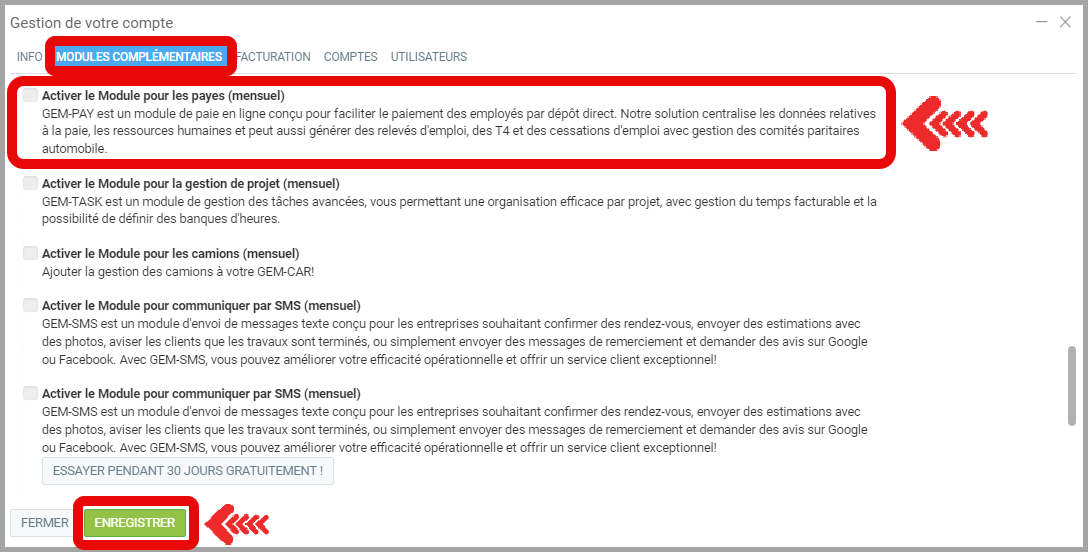 Sélectionnez Activer le Module pour les payes (mensuel).