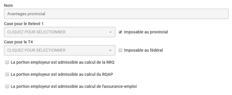 Si vous désirez ajouter des avantages non monétaires, par exemple, la location d'une voiture, c'est ici que vous pouvez configurer ceux-ci. Les avantages non monétaires font en sorte que la ressource humaine est imposée sur la valeur de l'avantage.