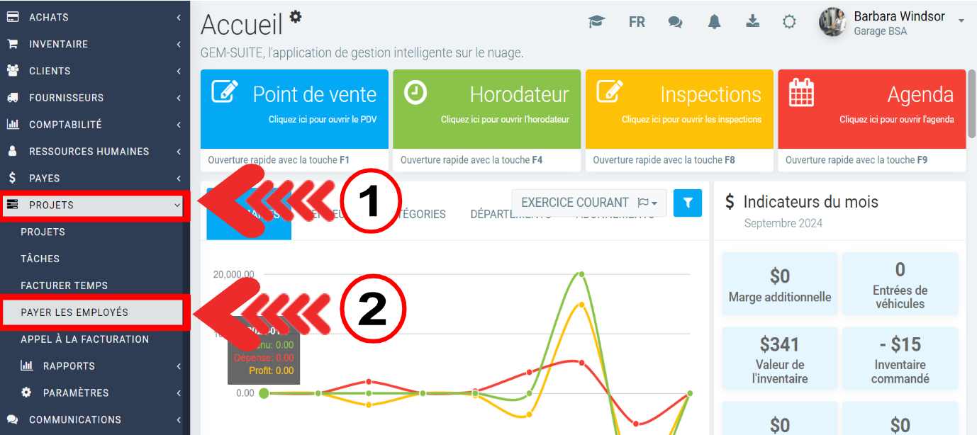 Pour déterminer le montant à payer à chaque employé en fonction de leurs heures travaillées:- Depuis le menu principal, cliquez sur Projets > Payer les employés.