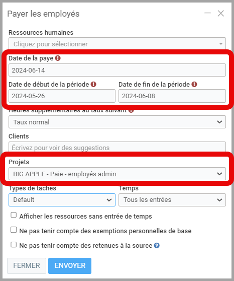 - Sélectionnez la date de Paye, qui est la date à laquelle les employés seront payés.