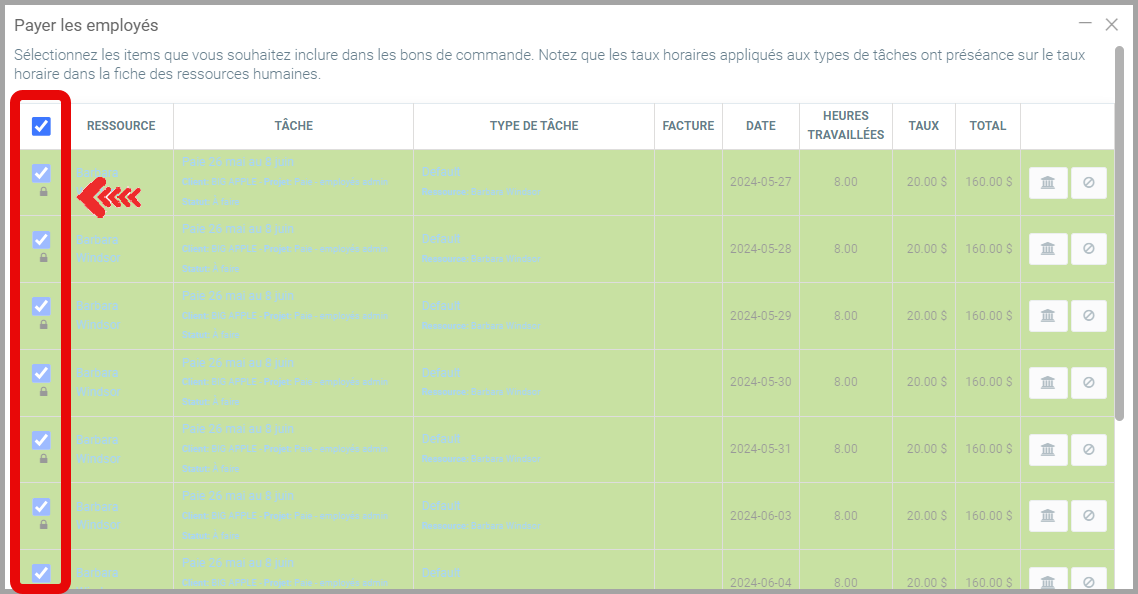 - Sélectionnez et confirmez les heures spécifiques que vous souhaitez inclure dans le Rapport de Paye, qui seront utilisées pour calculer le salaire final de chaque employé.