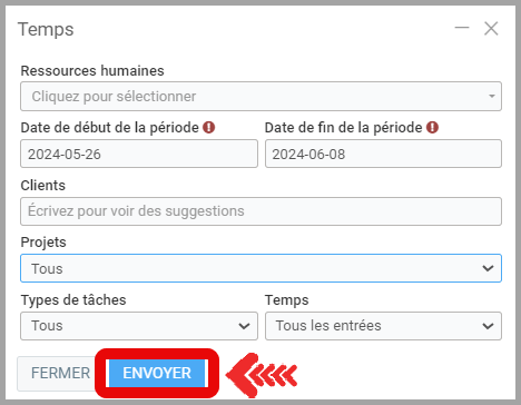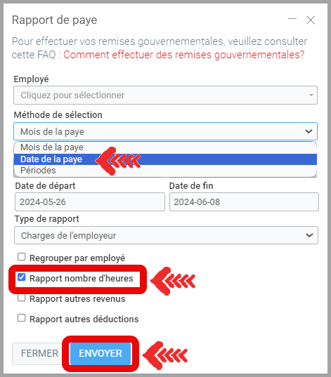 - Cochez l'option Rapport du nombre d'heures et cliquez sur Envoyer.