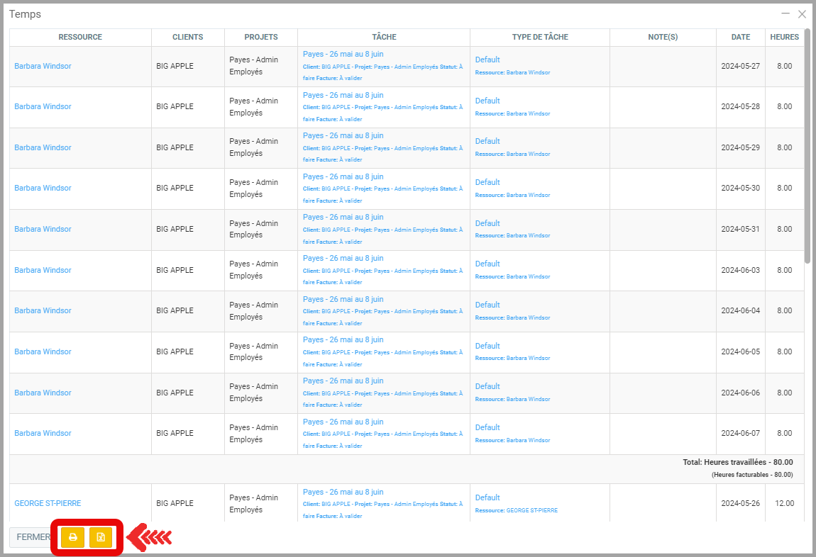 - Le rapport affichera le total des heures travaillées par chaque employé pour la période et le projet sélectionnés (si applicable).
