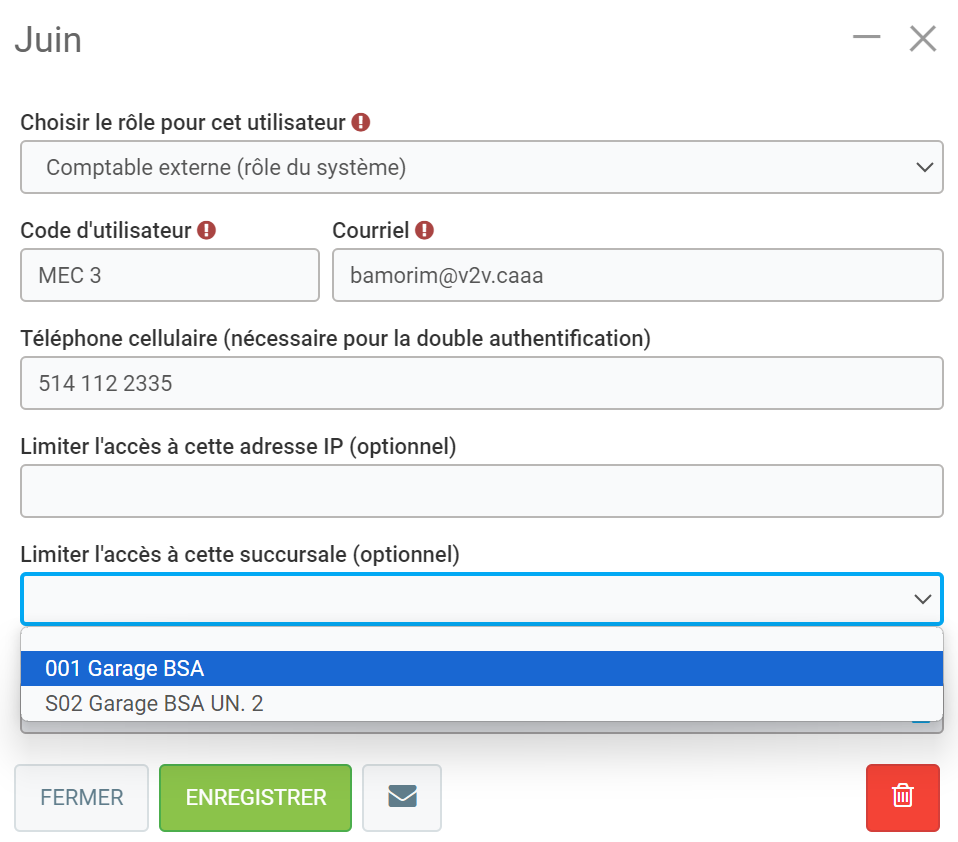 Si vous laissez le champ vide, l'utilisateur aura accès à toutes les succursales existantes de votre entreprise. Le cas échéant.