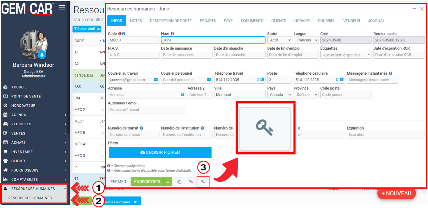 Quand vous cliquez sur le logo de la clé, GEM-CAR vous présente une fenêtre contextuelle à partir de laquelle l'accès aux données sera défini pour June.