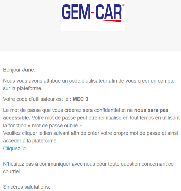 Les données seront sauvegardées, le nouvel utilisateur sera créé et un courriel sera immédiatement généré par GEM-CAR et envoyé au nouvel utilisateur, pour l'informer de son identifiant et l'inviter à aller définir lui-même son mot de passe.