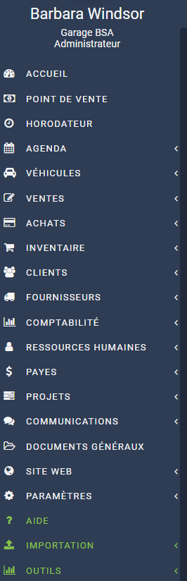 Cette façon de gérer et définir les accès propres à chaque utilisateur explique pourquoi Barbara Windsor, qui est administrateur de l'entreprise, verra apparaître ce menu exhaustif.