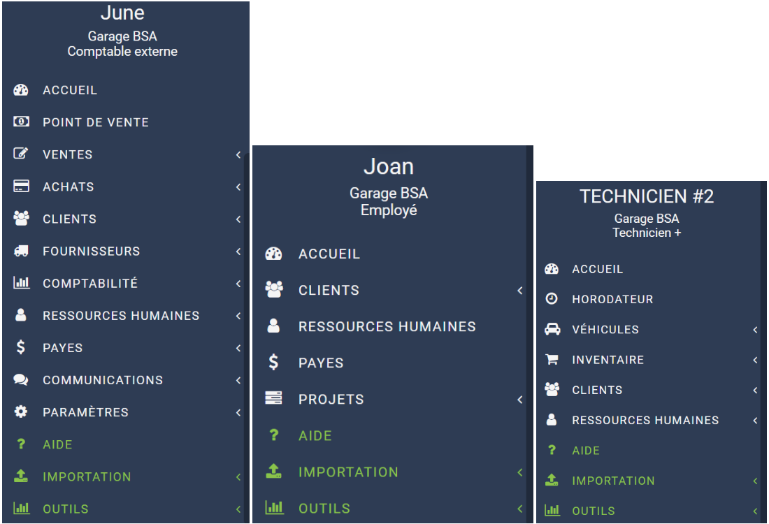June, Joan et Technicien #2 qui sont respectivement comptable externe, employé et technicien de l'entreprise verront les menus suivants s'afficher sur leurs écrans respectifs.