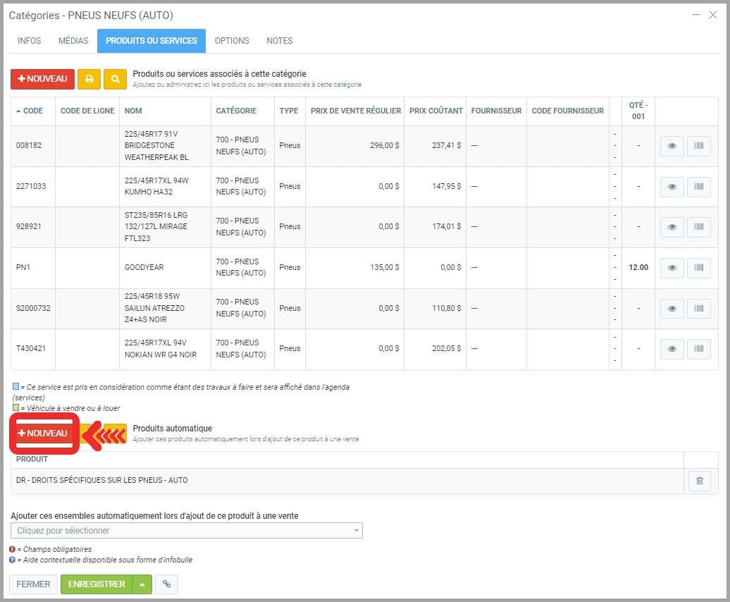 - Pour chacune des 2 catégories, sous l'onglet Produits et Services, dans la section Produits automatiques, liez le produit Droits spécifiques en cliquant sur +Nouveau.