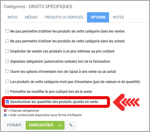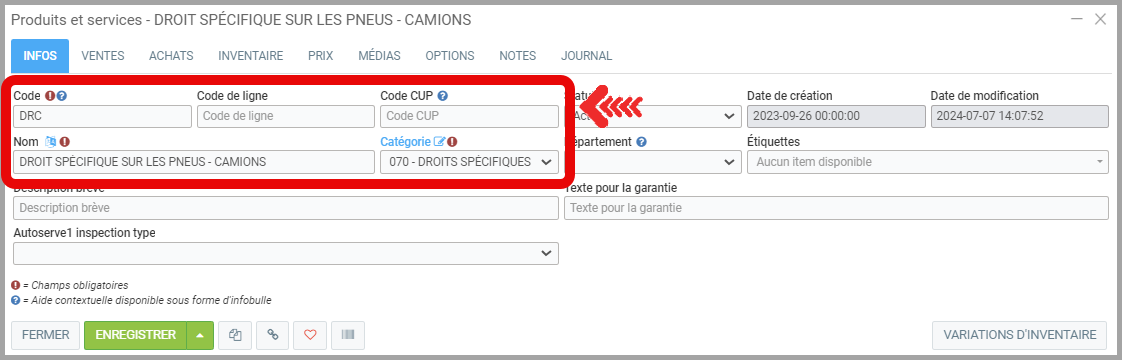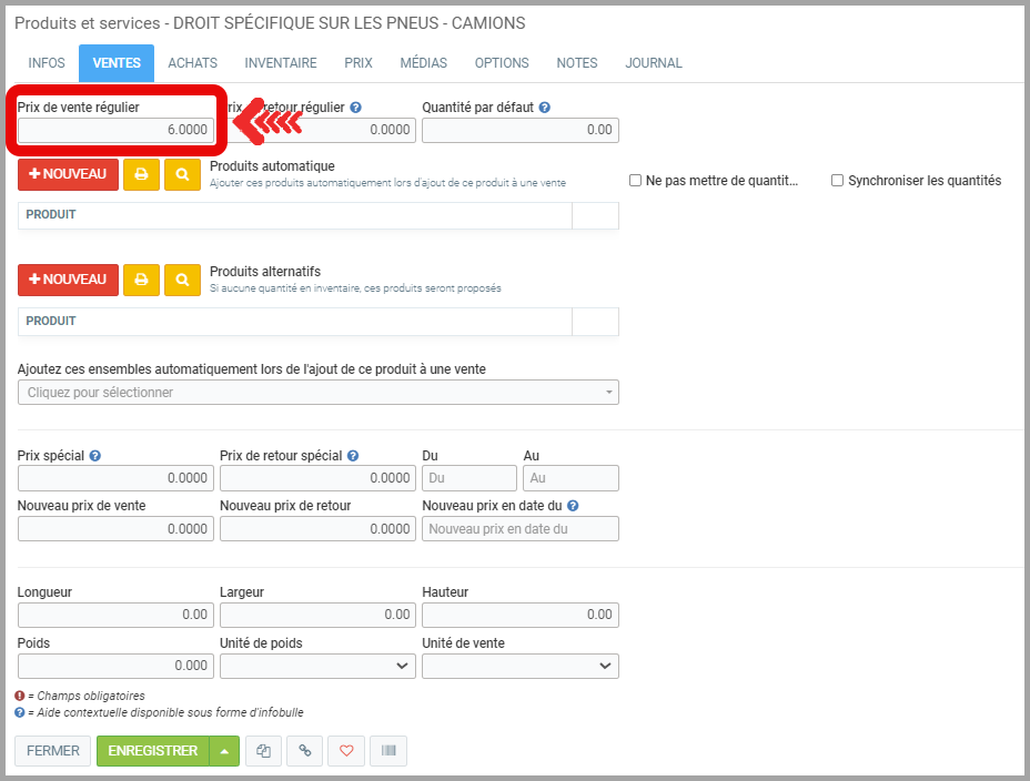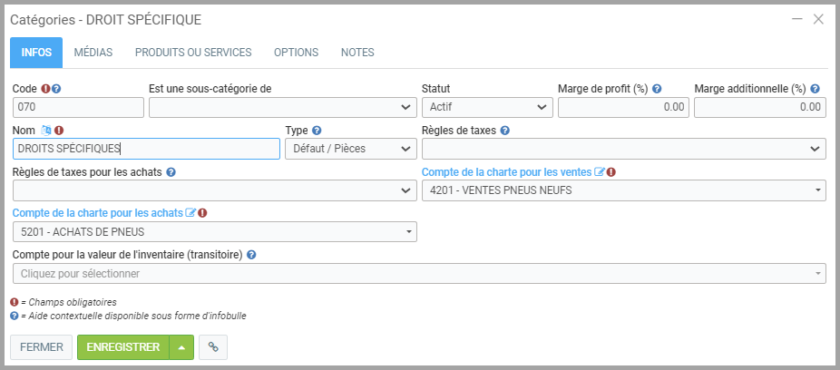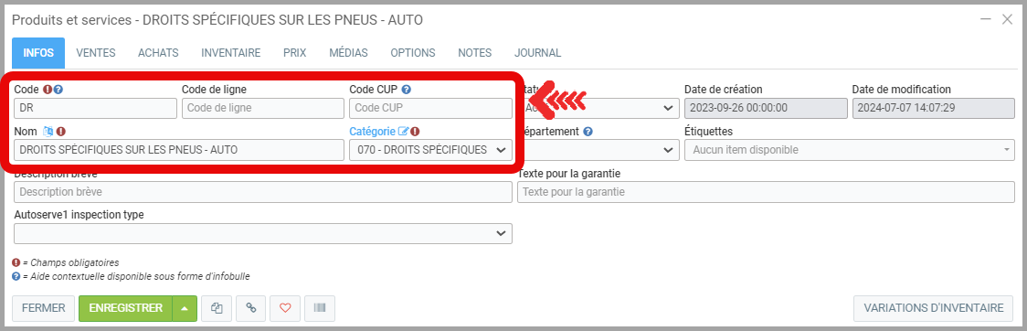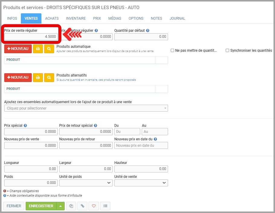 Maintenant, lors de la vente de produits de la catégorie Pneus neufs, les droits spécifiques s'ajouteront automatiquement.