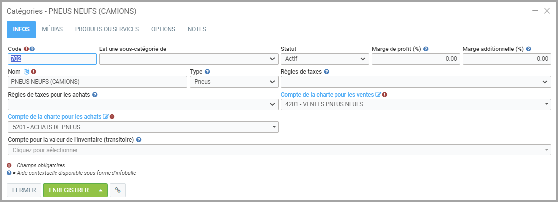 - Créez les 2 catégories de Pneus neufs: auto et camion.