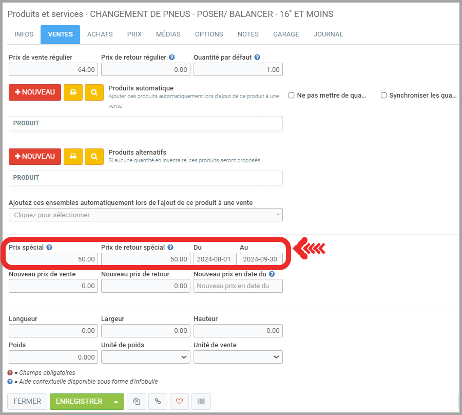 - Cliquez sur l'onglet Ventes et complétez le Prix spécial, le Prix de retour du spécial et la période pendant laquelle doit s'appliquer le spécial (Du/ Au).