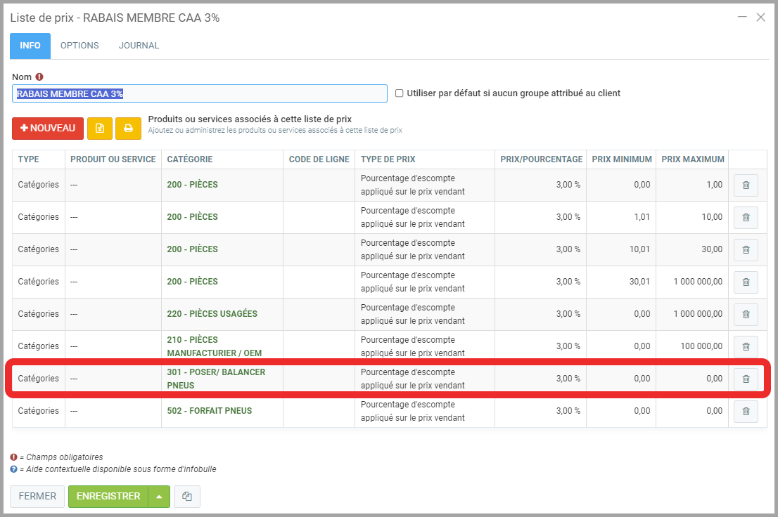 Pour appliquer un escompte sur les pneus et services de pneus, il faut créer la liste de prix avec laquelle un escompte sur le prix vendant est appliqué. Par exemple, un membre CAA pourrait bénéficier d'un escompte qui s'appliquerait en plus des prix réguliers. Voir Application d'un rabais CAA ou autre sur le prix vendant pour plus de détails. De la même façon, il pourrait aussi être possible d'ajouter un prix employé.