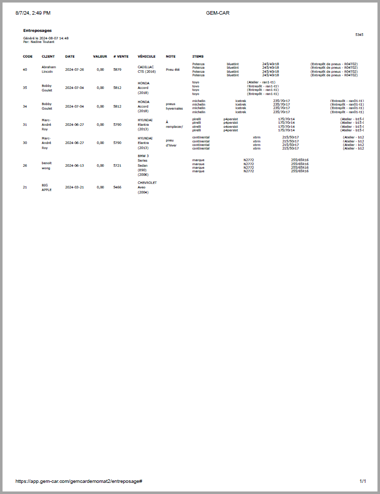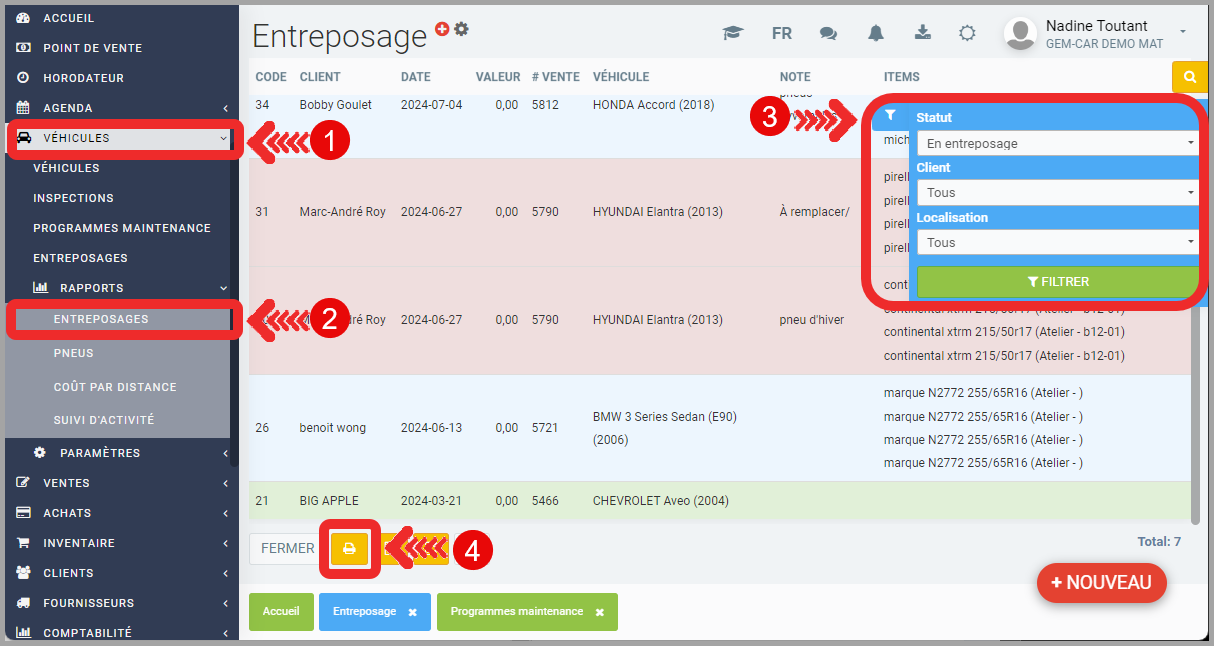 - Pour imprimer la liste des entreposages, à partir du menu principal situé à gauche de l'application, cliquez sur Véhicules > Entreposage.