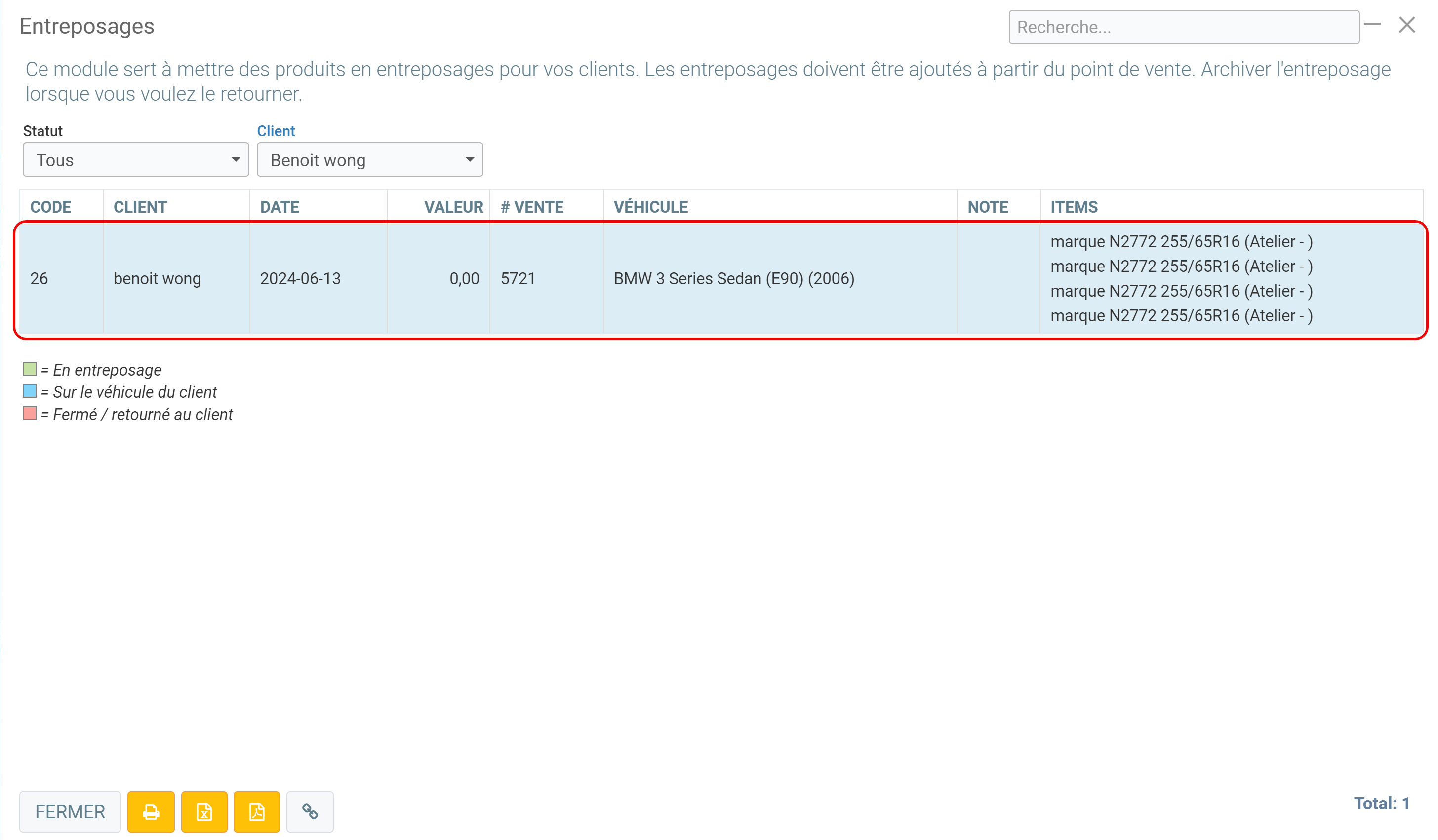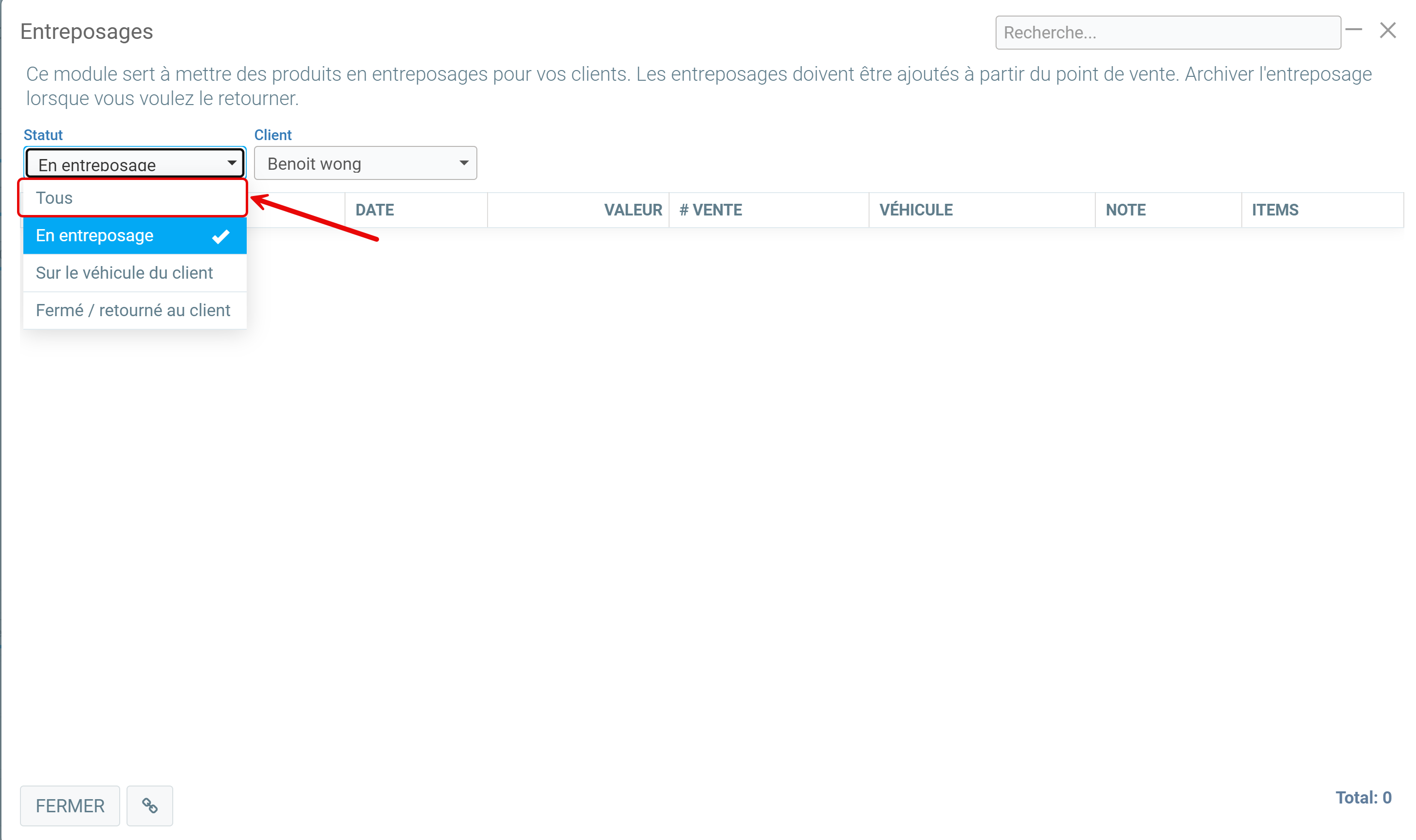 Depuis le Point de vente, choisissez votre client, si l'icône d’entreposage apparaît bleu cela signifie qu’il ya un historique d’entreposage de pneus. Si ce n’est pas le cas, cliquez ici pour en apprendre davantage. Sélectionnez l'icône. La fenêtre d’entreposage de pneus apparaît à l’écran mais afin de pouvoir observer tous les enregistrer en entreposages, sous le menu déroulant statut, choisissez TOUS.