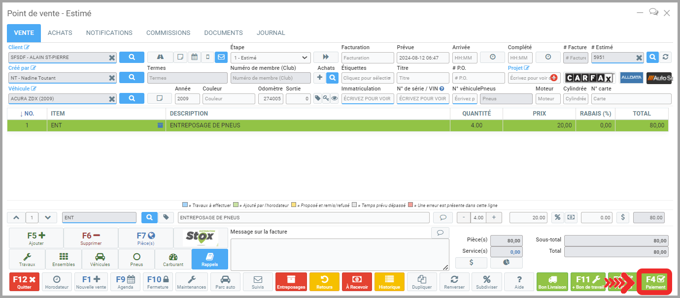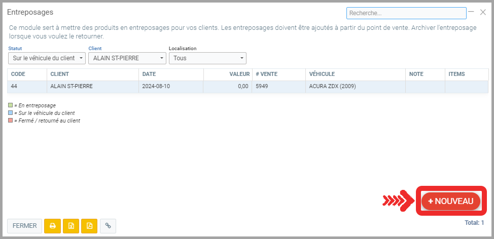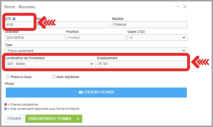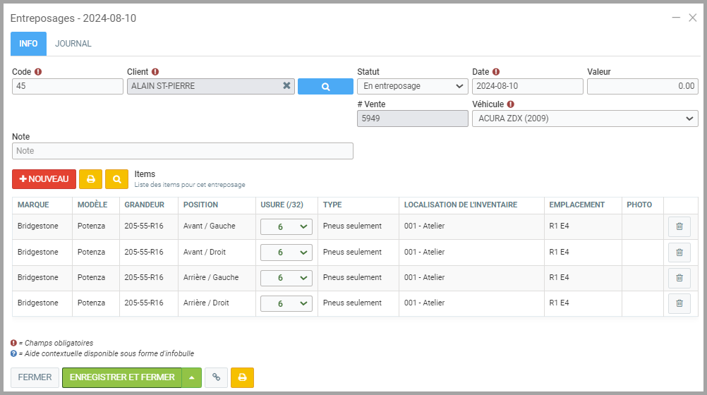 - Entrez également l'emplacement où les pneus seront entreposés pour faciliter leur localisation au retour d'entreposage au client.