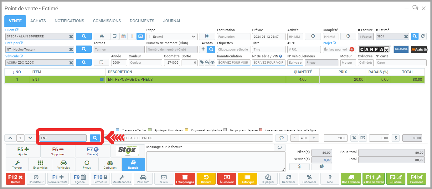 - À partir du Point de Vente, entrez le code de produit ENT. Il s'agit du code de produit configuré par défaut pour l'entreposage de pneus. Appuyez ensuite sur la touche ENTER.