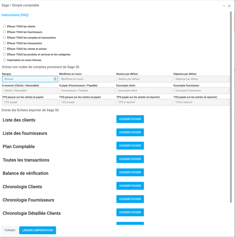 Note: en raison des liens entre les factures et les encaissements dans le logiciel Sage 50, nous vous suggérons d'importer uniquement les données de l'exercice courant, et de conserver vos archives des exercices précédents dans Sage 50.