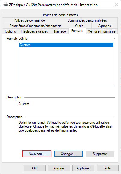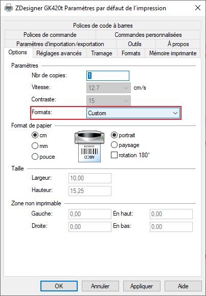 - De retour à la fenêtre des propriétés de l'imprimante, cliquez sur l'onglet Options > sélectionnez Custom ou Étiquette (dépendamment du nom qui a été donné au format à l'étape 5) comme Formats > Appliquer > OK.
