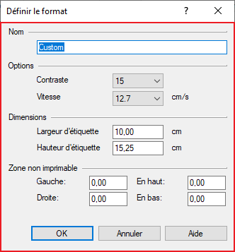 - Entrez un Nom pour le format et les Dimensions pour les étiquettes. Par exemple, le nom pourrait être Custom ou Étiquette et les dimensions, 10 x 15.25 cm.