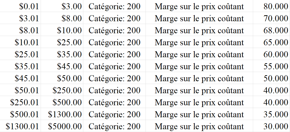 - On regarde dans quelle braquet le coûtant est : on garde la marge en mémoire A (Braquet de 10.01 à 20.00 à 40% de marge)