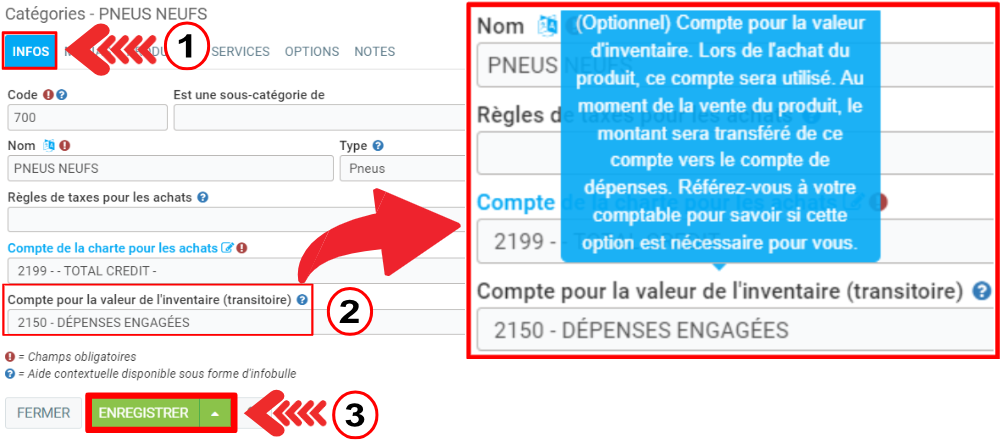 Si vous voulez savoir ce que signifie ce compte, passez votre souris sur le point d'interrogation à côté de l'option "Compte pour la valeur de l'inventaire (transitoire)". Une info-bulle bleue s'affichera pour expliquer la signification de ce compte: "(Optionnel) Compte pour la valeur d'inventaire. Lors de l'achat du produit, ce compte sera utilisé. Au moment de la vente du produit, le montant sera transféré de ce compte vers le compte le dépenses. Référez-vous à votre comptable pour savoir si cette option est nécessaire pour vous".
