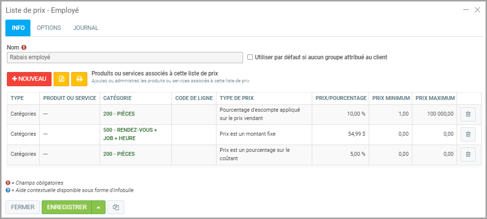Pour créer un rabais de groupe, vous devez créer une liste de prix que vous ajouterez ultérieurement au dossier de votre client.
