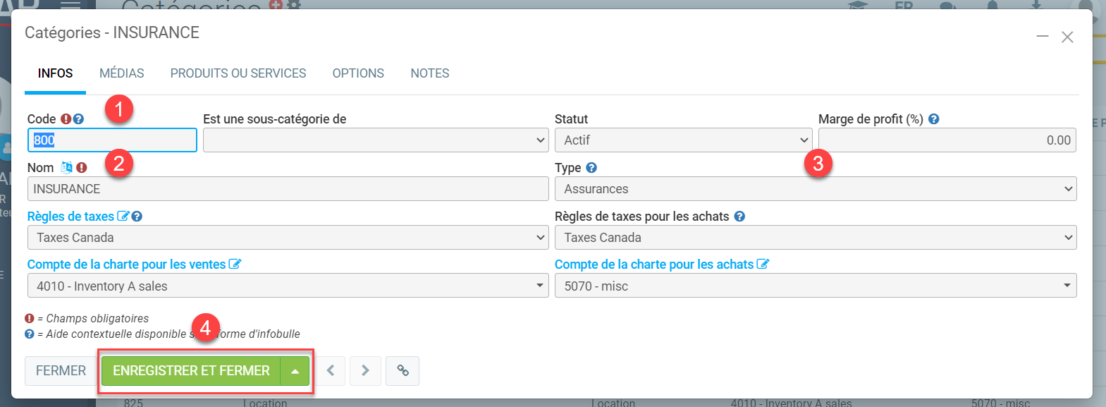 - Ajoutez un code et un nom (description) pour la nouvelle catégorie créée.
