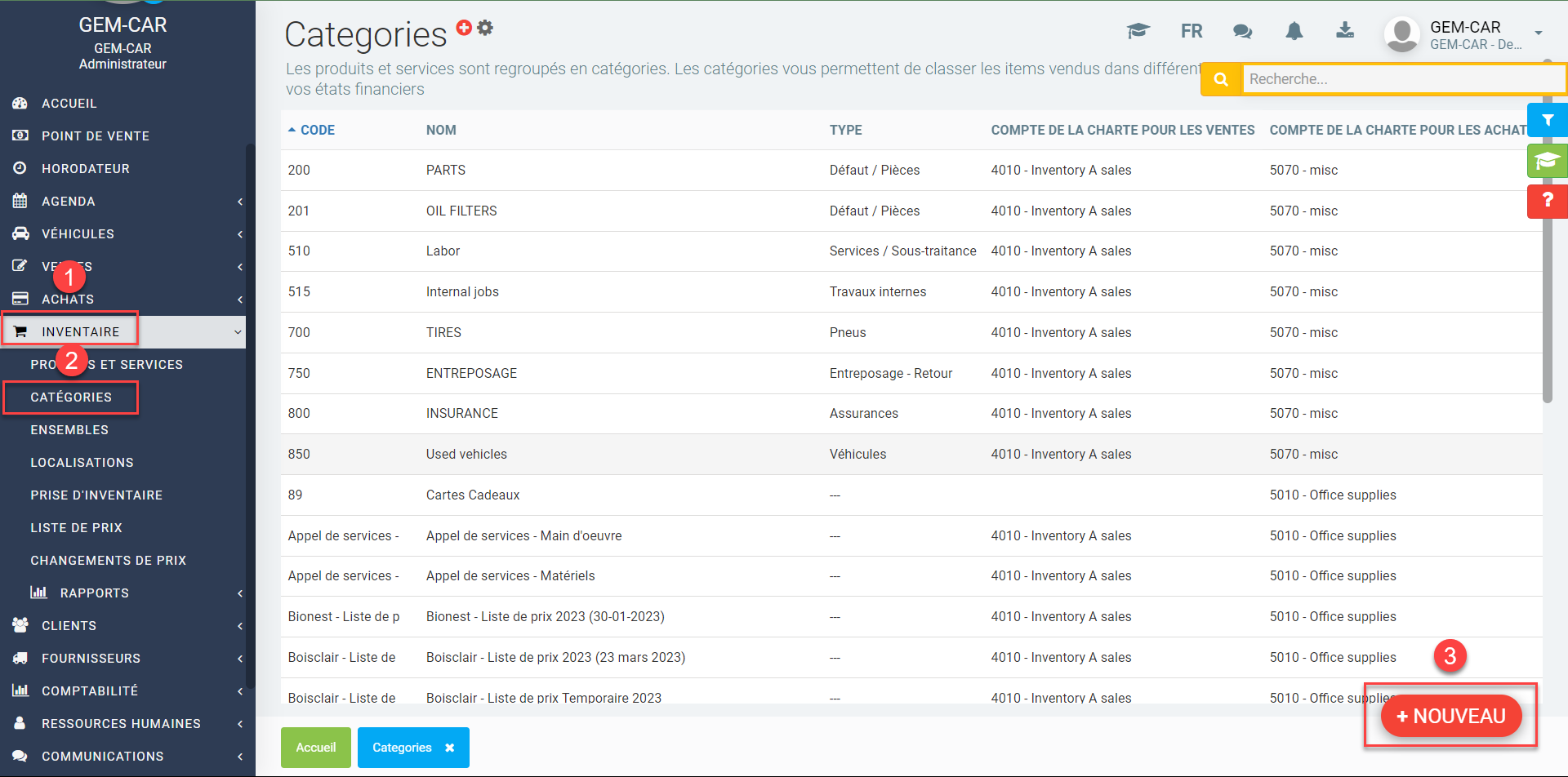 - Dans le Menu principal situé à gauche de l'application, cliquez sur Inventaire > Catégories > +Nouveau.
