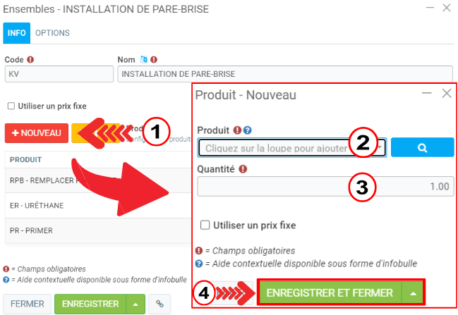 Pour ajouter des produits supplémentaires à l'ensemble, cliquez sur +Nouveau et sélectionner le produit et la quantité que vous voulez ajouter à l'ensemble.
