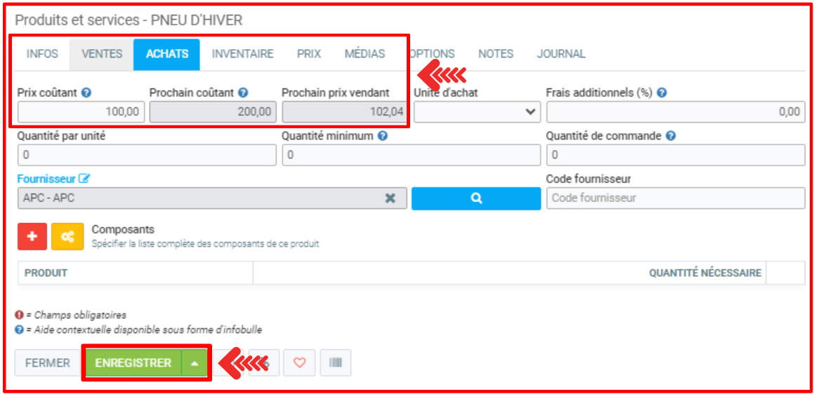 Choisissez le produit que vous souhaitez. Dans l'onglet Achats, vous verrez les options prix coûtant, prochain coûtant et prochain prix vendant.