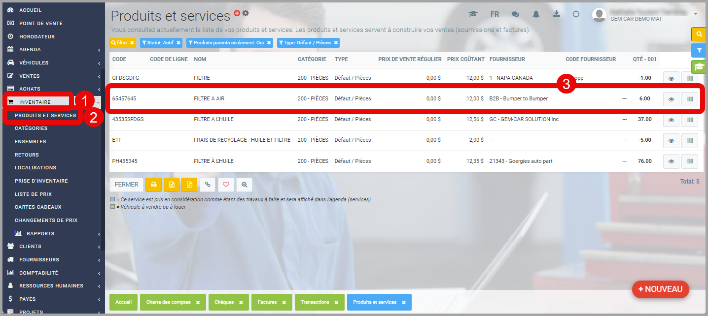 À partir du menu principal situé à gauche de l'application, cliquez sur Inventaire > Produits et Services > Sélectionnez le Produit ou Service pour lequel vous souhaitez modifier l'inventaire.
