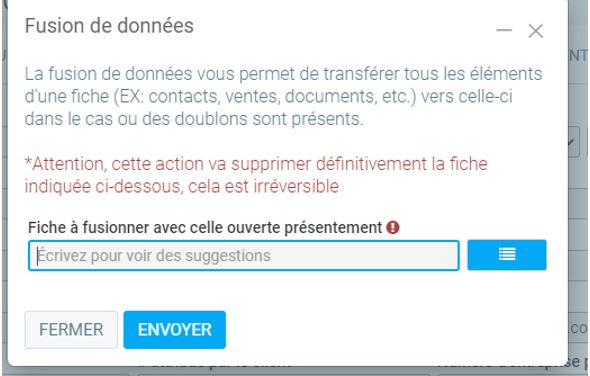 Inscrivez ou recherchez avec le bouton bleu afin de sélectionner la fiche que vous voulez fusionner sur la fiche actuelle. Il est très important de noter que cette action est irréversible, donc il vous faut être certain de ce que vous faites.