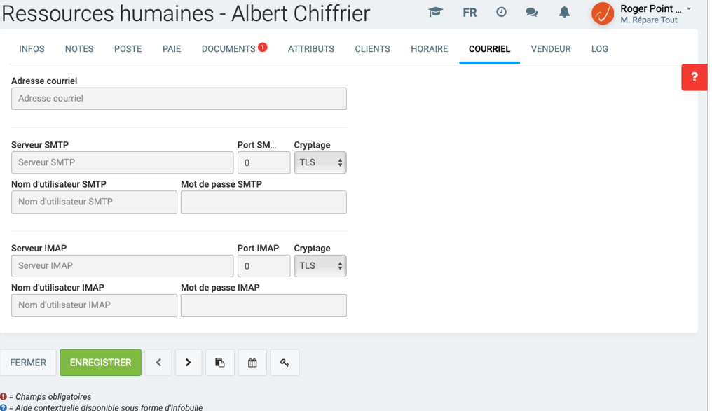 Cet onglet de votre fiche permet de créer une adresse courriel appartenant à l'entreprise et qui sera réservée à l'utilisation exclusive par cette ressource humaine. L'avantage qui en résulte est de permettre l'archivage des échanges courriel entre votre ressource humaine et tous ceux avec qui elle correspond, aussi bien les courriels envoyés depuis cette adresse que ceux reçus à cette même adresse.