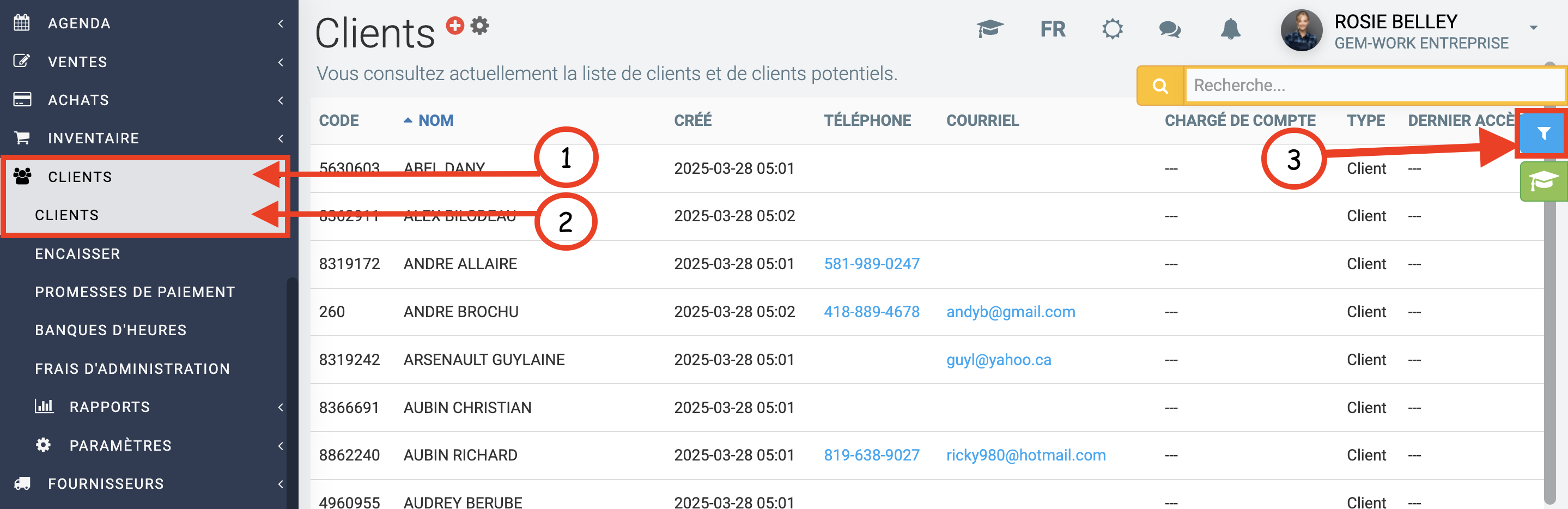 Pour les rendre visibles, cliquez sur le menu Clients > Clients et cliquez sur l'icône bleue des listes dans le coin supérieur droit.