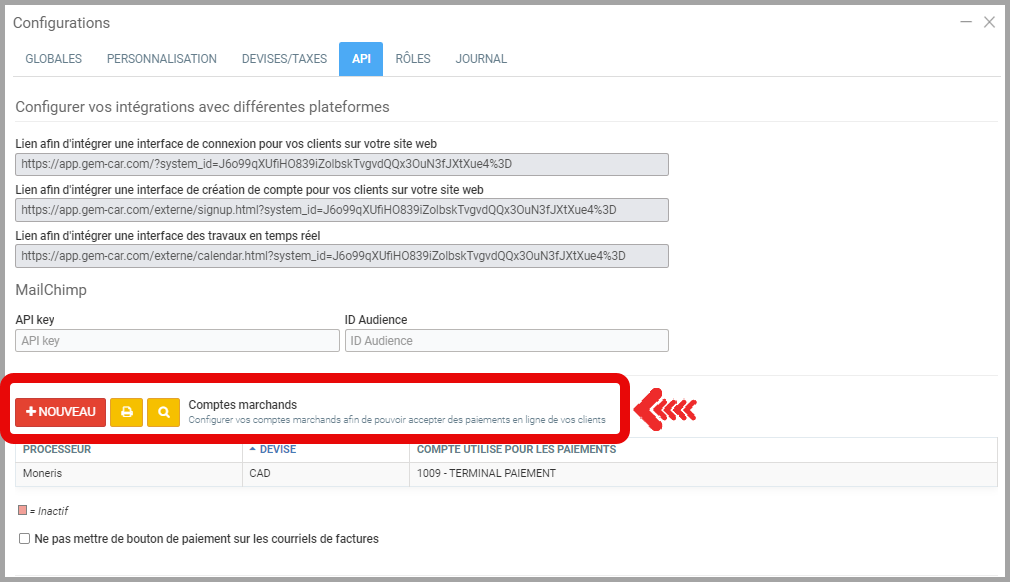 Cliquez sur l'onglet API > +Nouveau pour les Comptes marchands.