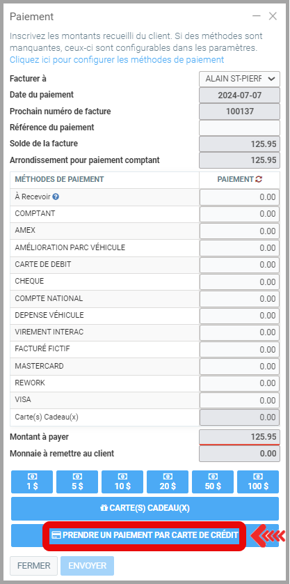 Cliquez sur Paiement (F4). Si la configuration a été effectuée correctement, vous devriez maintenant voir Accepter un paiement par carte de crédit en bas de la fenêtre.