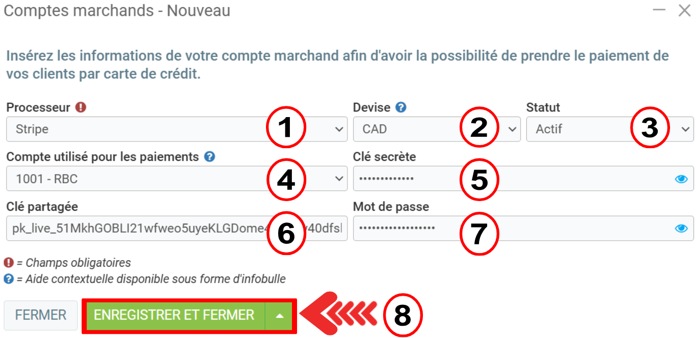 Il ne vous reste plus qu'à confirmer avec le client le compte qu'il utilisera pour les paiements, et cliquez sur Enregistrer et fermer.