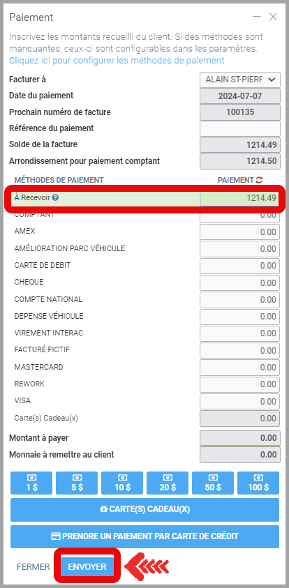 - Pour la Méthode de paiement À Recevoir, inscrivez le montant à être payé et cliquez sur Envoyer.