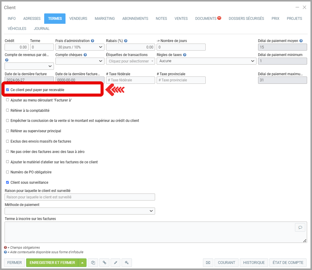 Note: Si le bouton Envoyer n'est pas cliquable à ce stade, il est très probable que le client à qui vous envoyez la facture ne soit pas autorisé à payer par recevables (sous l'onglet Termes de son dossier Client). Voir Créer un nouveau client: éléments importants pour plus de détails.