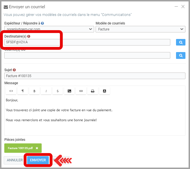 Saisissez l'adresse courriel à laquelle vous souhaitez que la facture soit envoyée, dans la section Destinataire(s) et cliquez sur Envoyer. Si la fenêtre n'ouvre pas automatiquement, vous pourrez trouver la facture sous l'onglet Documents de la vente et cliquez sur l'image d'enveloppe située sur la même ligne que le document.