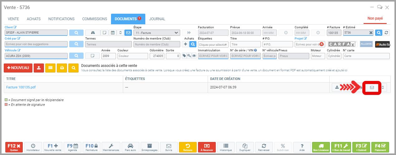 La facture apparaît désormais en rouge dans l'onglet Documents de la vente. L'enveloppe est de couleur jaune signifiant que la facture a été envoyée et passe au vert une fois lue. Pour accéder à la facture ou pour demander à nouveau des paiements, cliquez sur cette enveloppe.